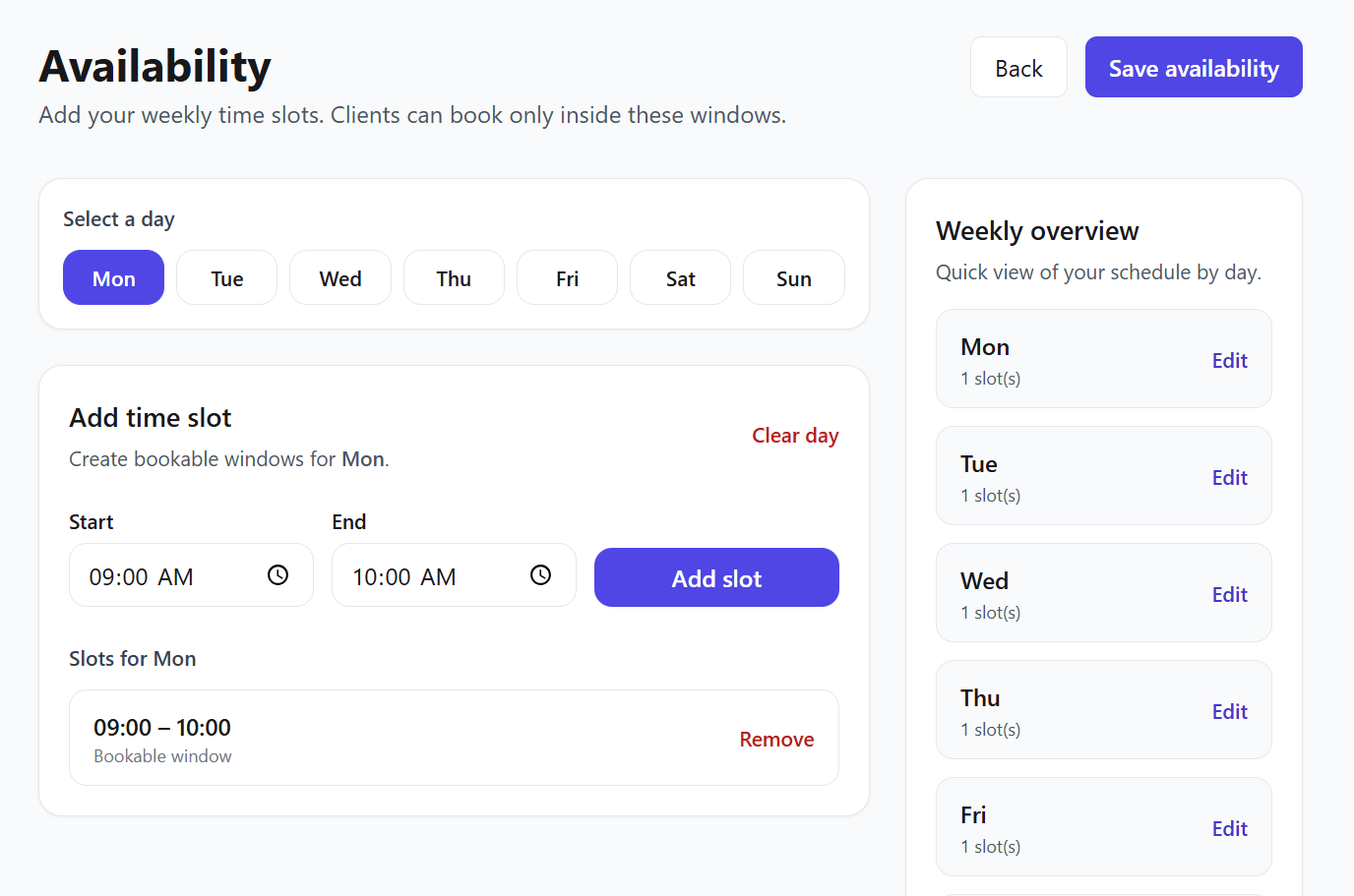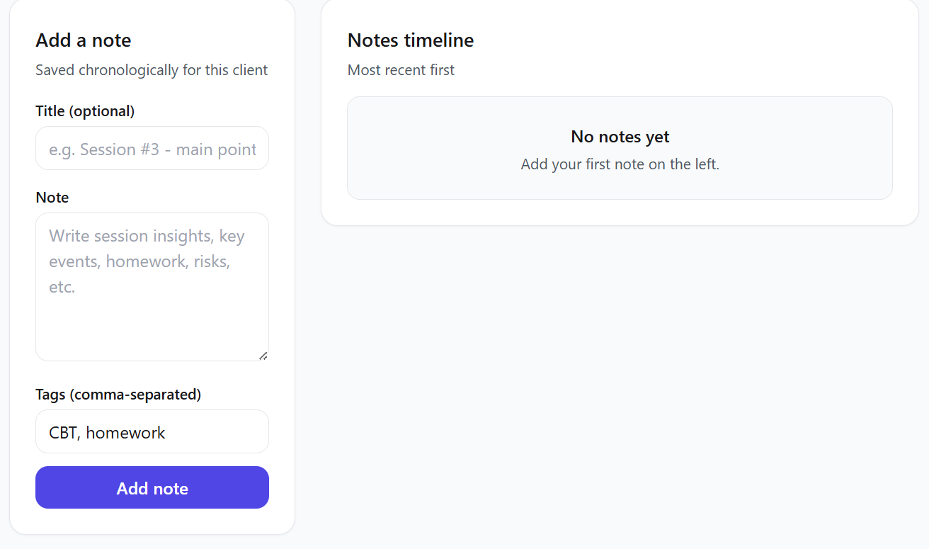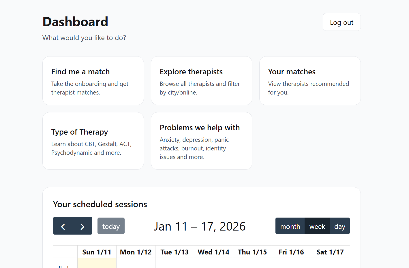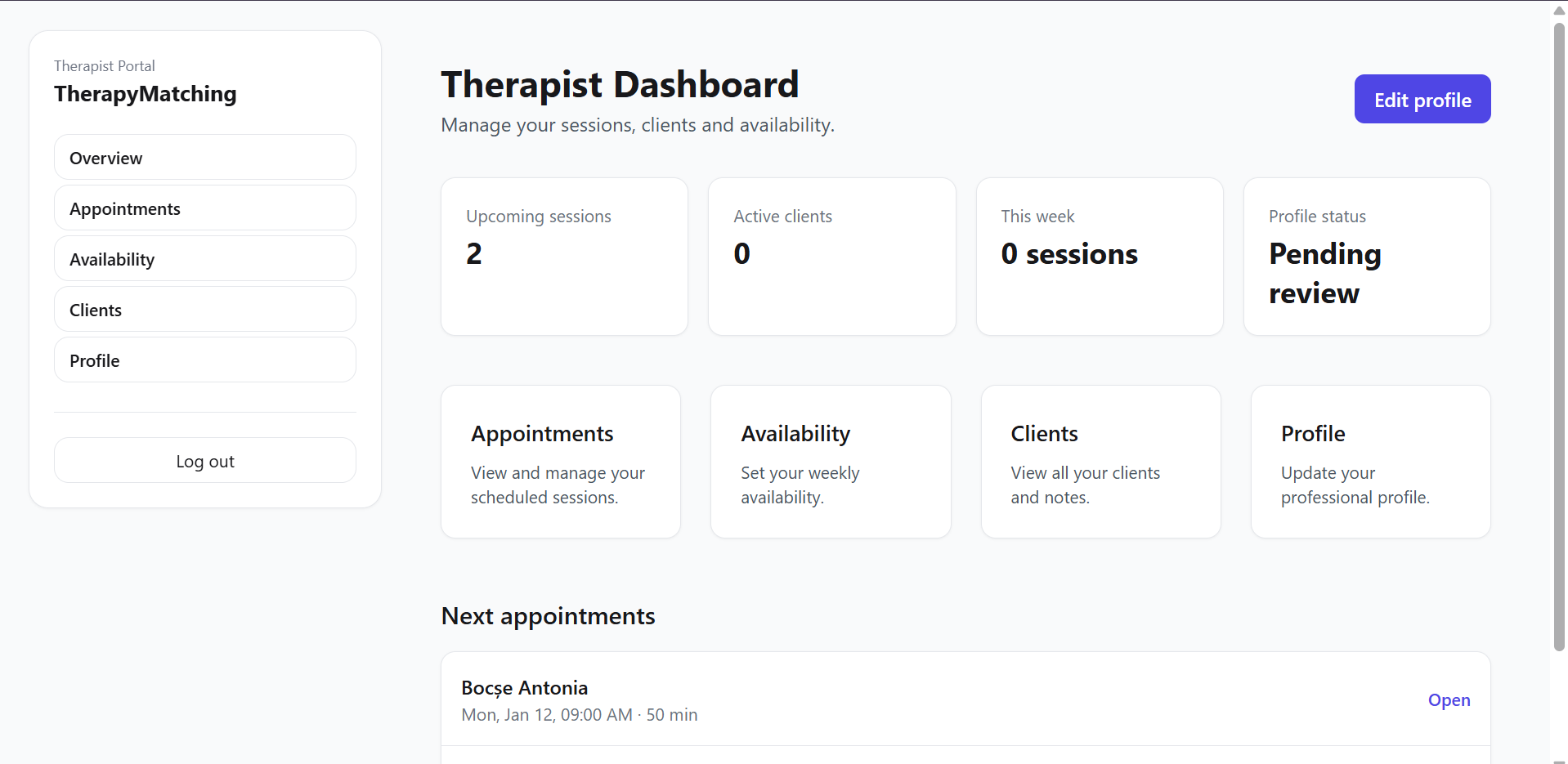 Pe parcurs, soluția s-a extins: pe lângă matching pentru clienți, Therapy Match oferă și o zonă dedicată terapeuților (mai ales juniori), cu instrumente pentru organizare (programări, profiluri clienți, notițe) și onboarding.