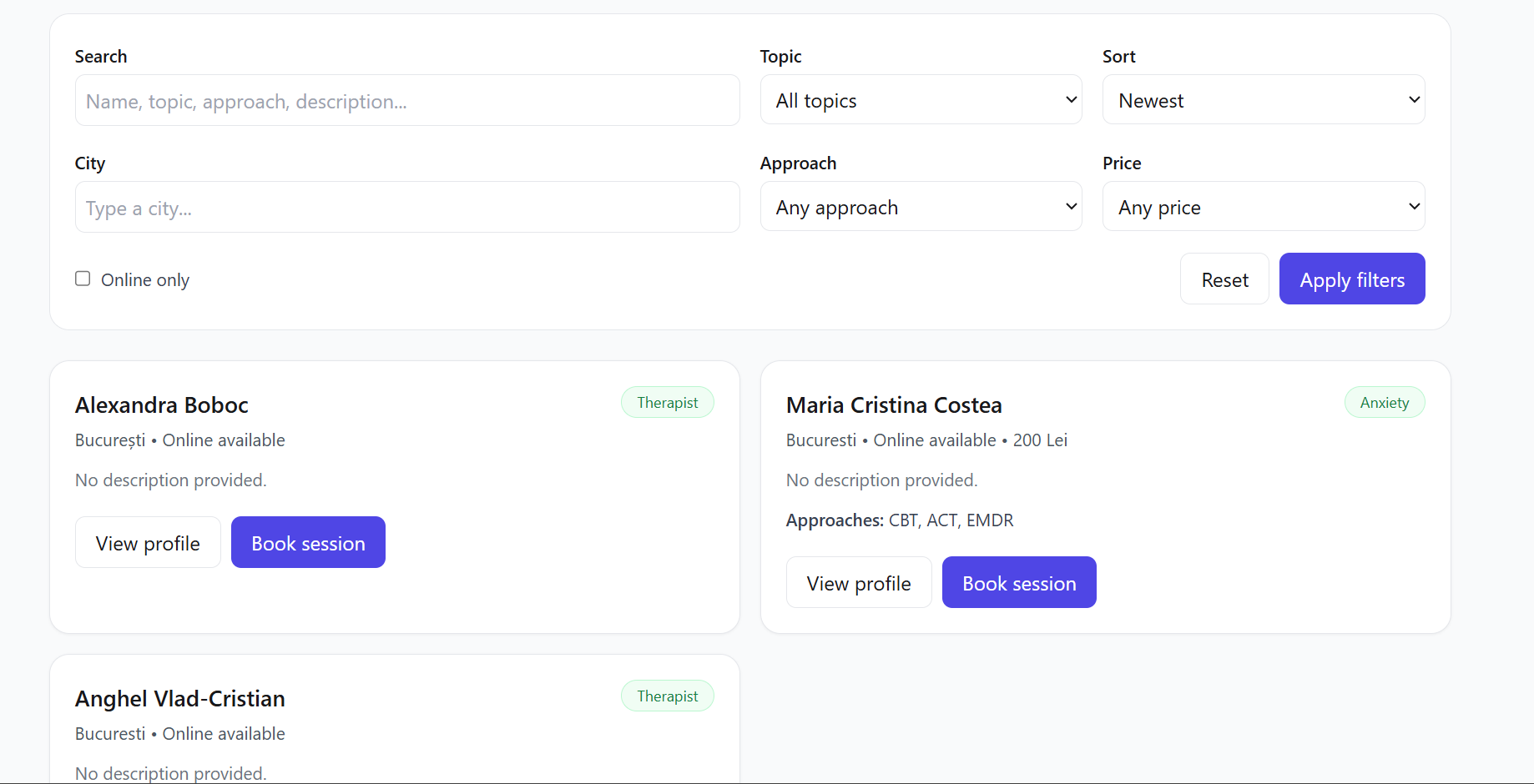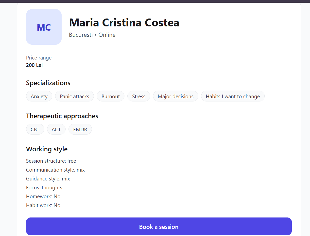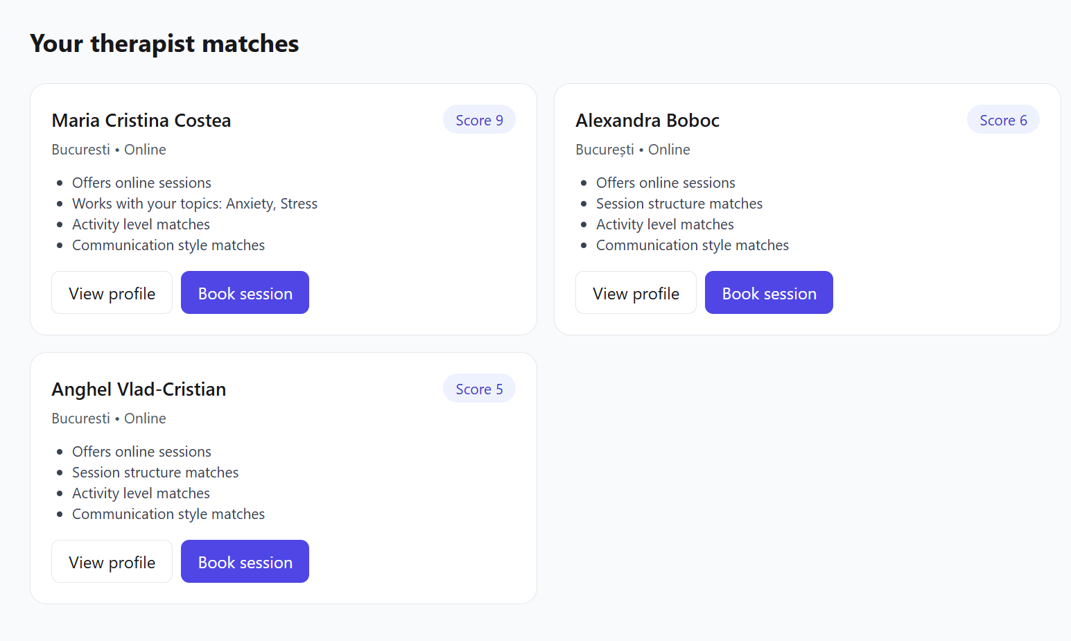 Am pornit de la observația că oamenii trebuie să aleagă un terapeut din liste mari, fără ghidaj clar și fără posibilitatea de a evalua compatibilitatea (stil, structură, personalitate). În practică, mulți aleg pe baza “vibe-ului”, pozelor și descrierii, iar potrivirea reală se descoperă abia după una sau mai multe încercări.