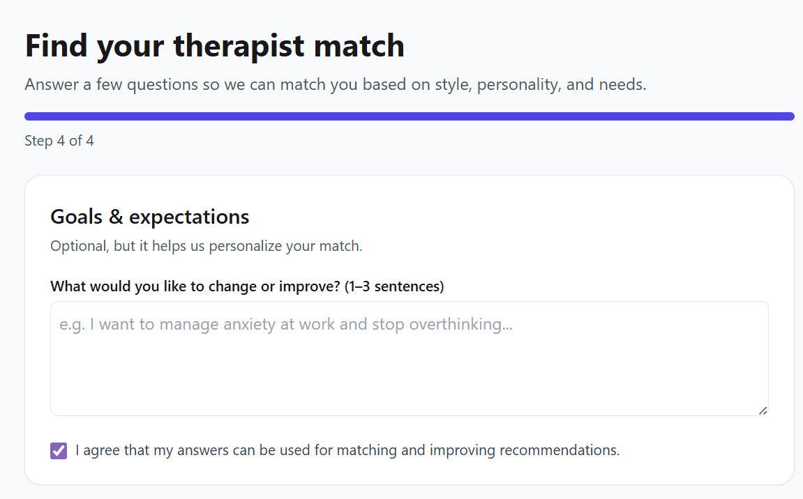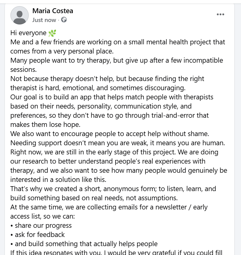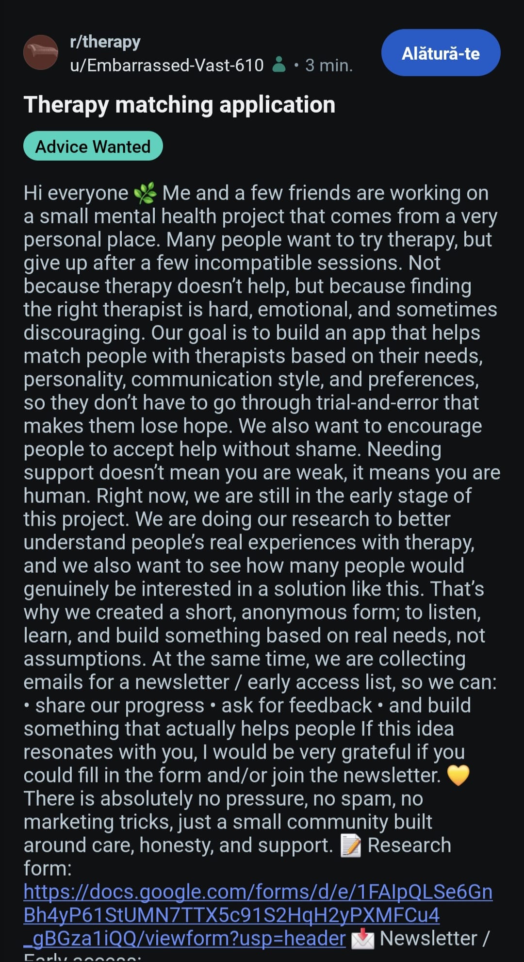 Am pornit de la observația că oamenii trebuie să aleagă un terapeut din liste mari, fără ghidaj clar și fără posibilitatea de a evalua compatibilitatea (stil, structură, personalitate). În practică, mulți aleg pe baza “vibe-ului”, pozelor și descrierii, iar potrivirea reală se descoperă abia după una sau mai multe încercări.