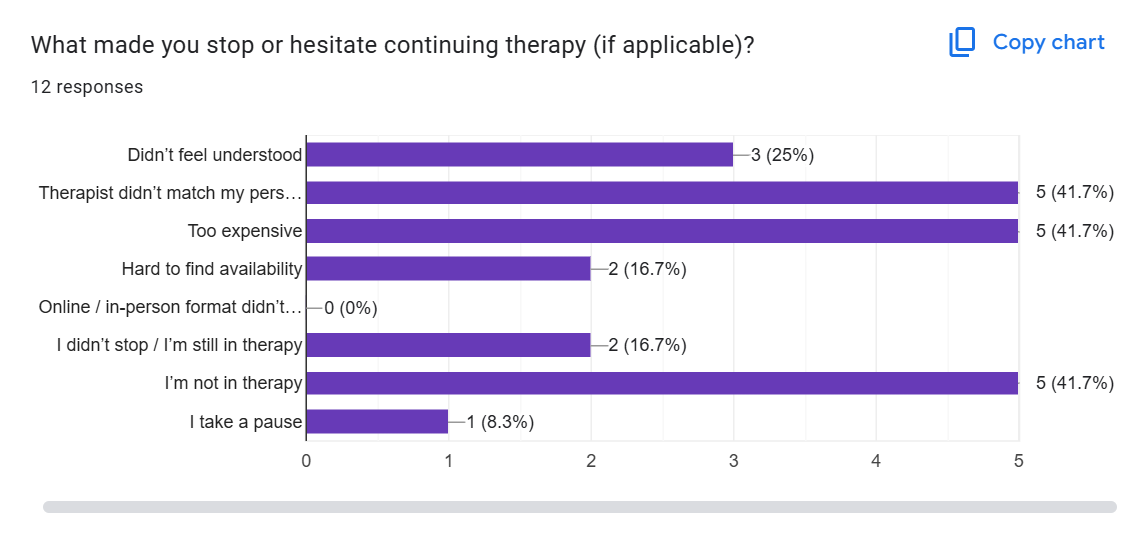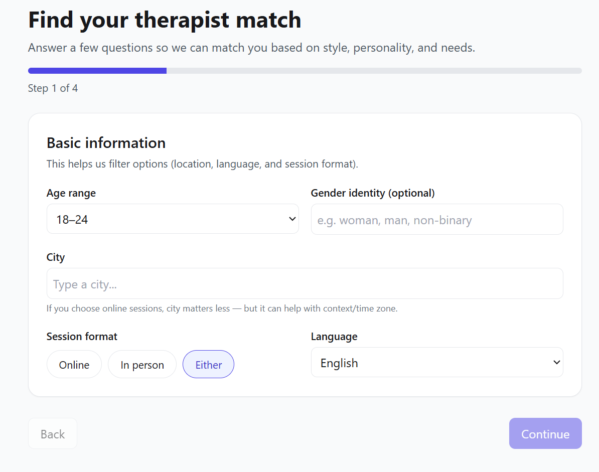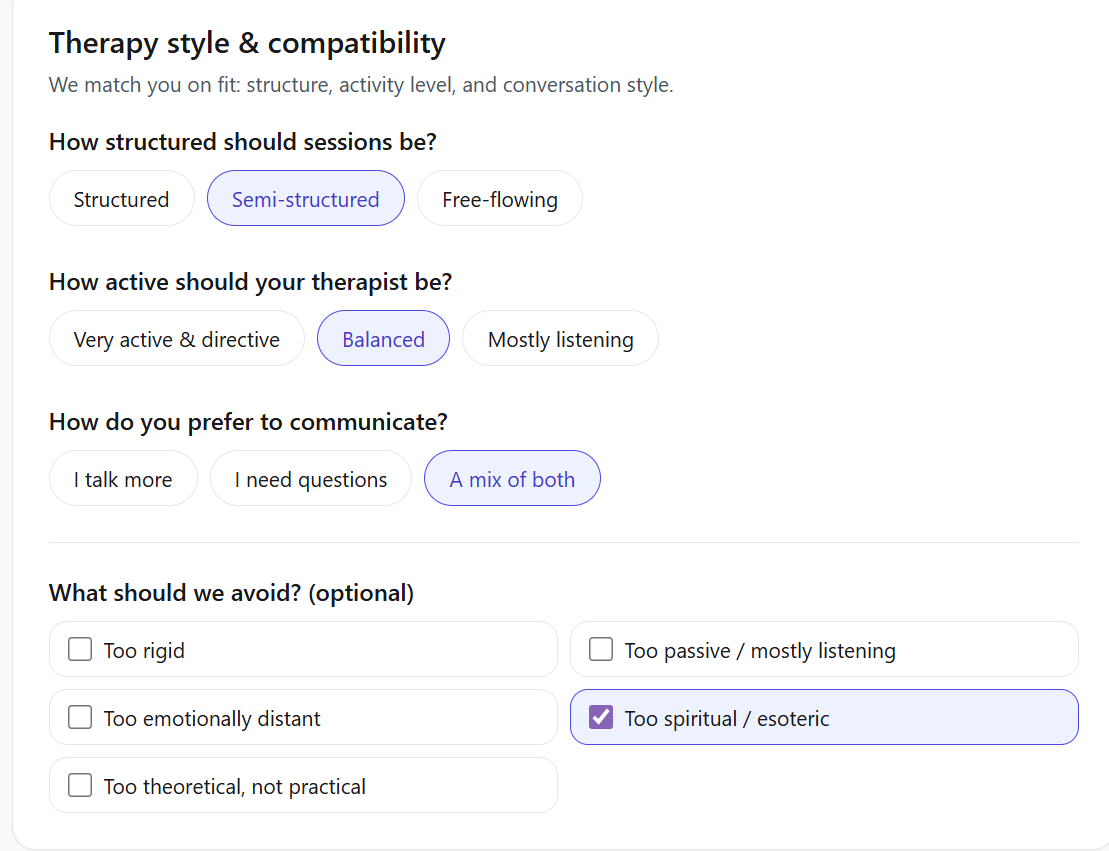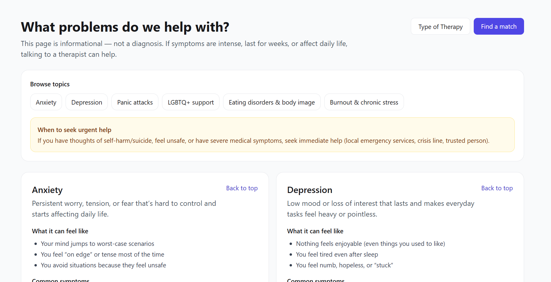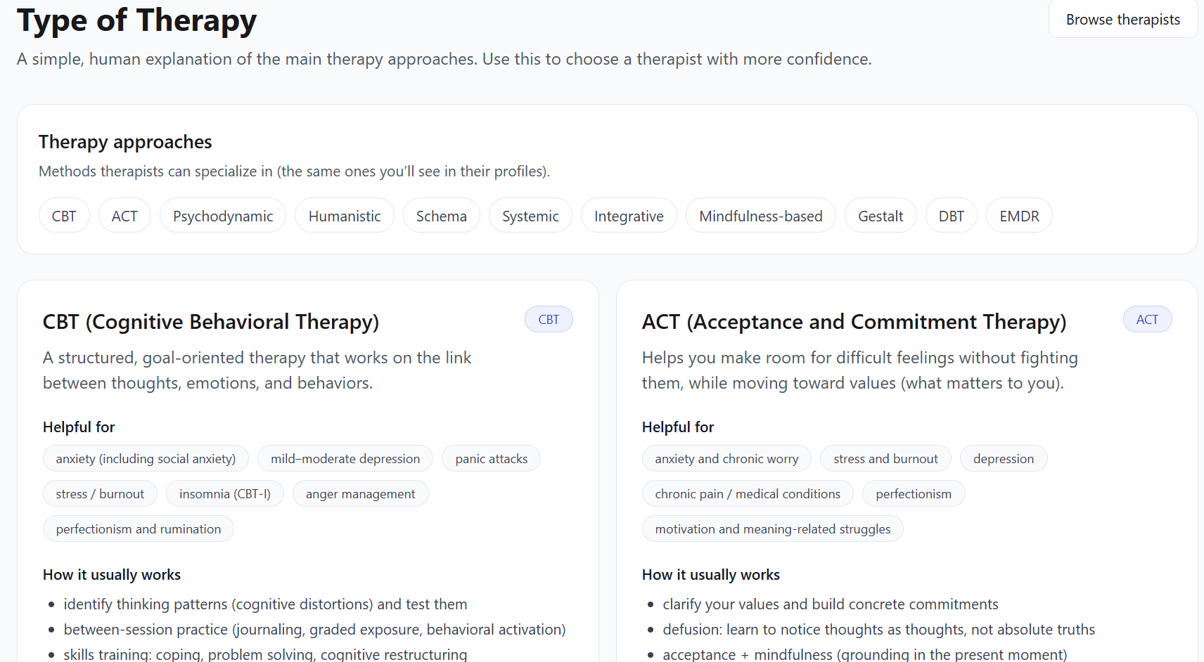 Utilizatorii nu cunoșteau tipurile de terapie și nu își identificau corect problema. Educația reduce confuzia și îmbunătățește calitatea matching-ului.