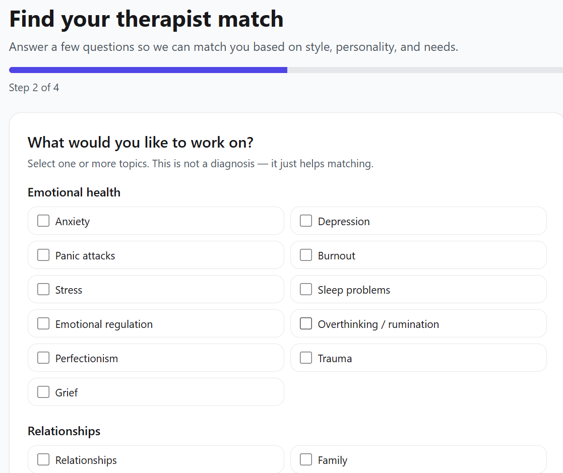 Găsirea unui terapeut potrivit este un proces haotic: liste lungi de opțiuni, lipsă de transparență despre metodologii, și compatibilitatea reală fiind descoperită prea târziu. În consecință, apare “oboseala decizională”, iar mulți pot renunța sau întâmpină ezitări în a începe terapia.