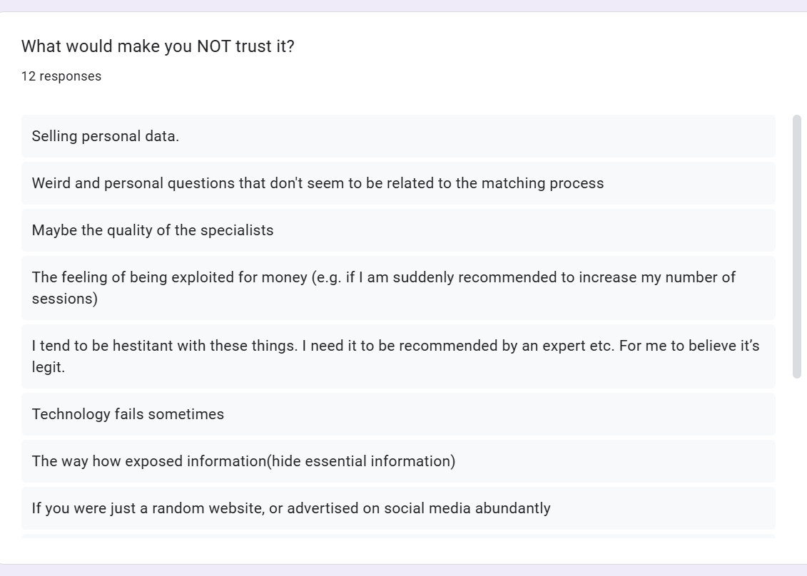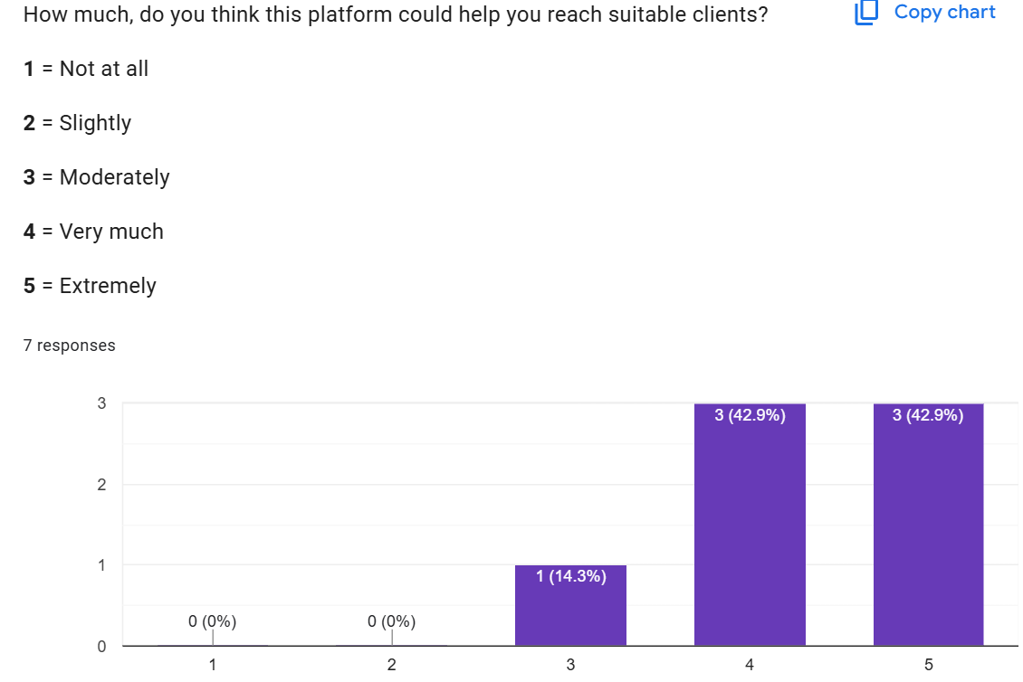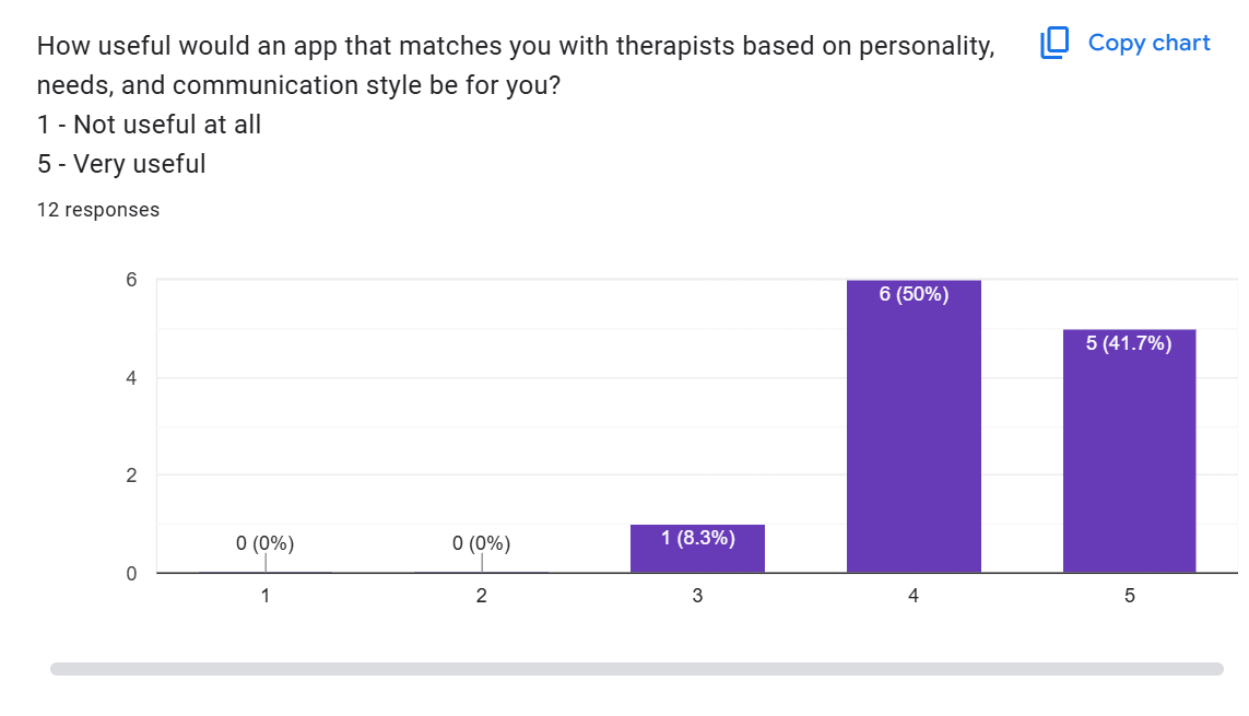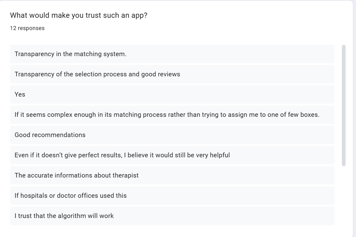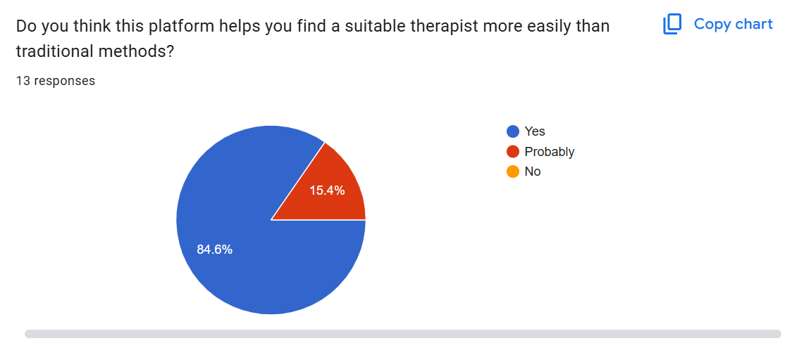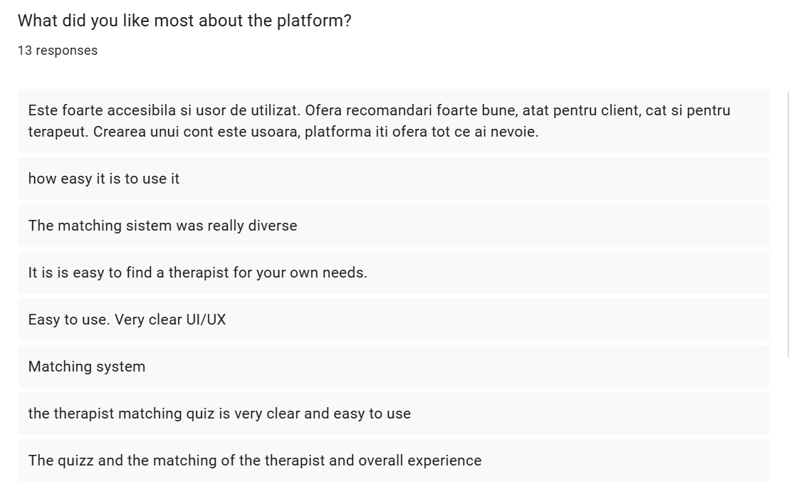 Am colectat feedback de la 7 terapeuți care au testat MVP-ul. Rezultatele validează: ușurința utilizării, utilitatea matching-ului și încrederea în produs pentru utilizare profesională.