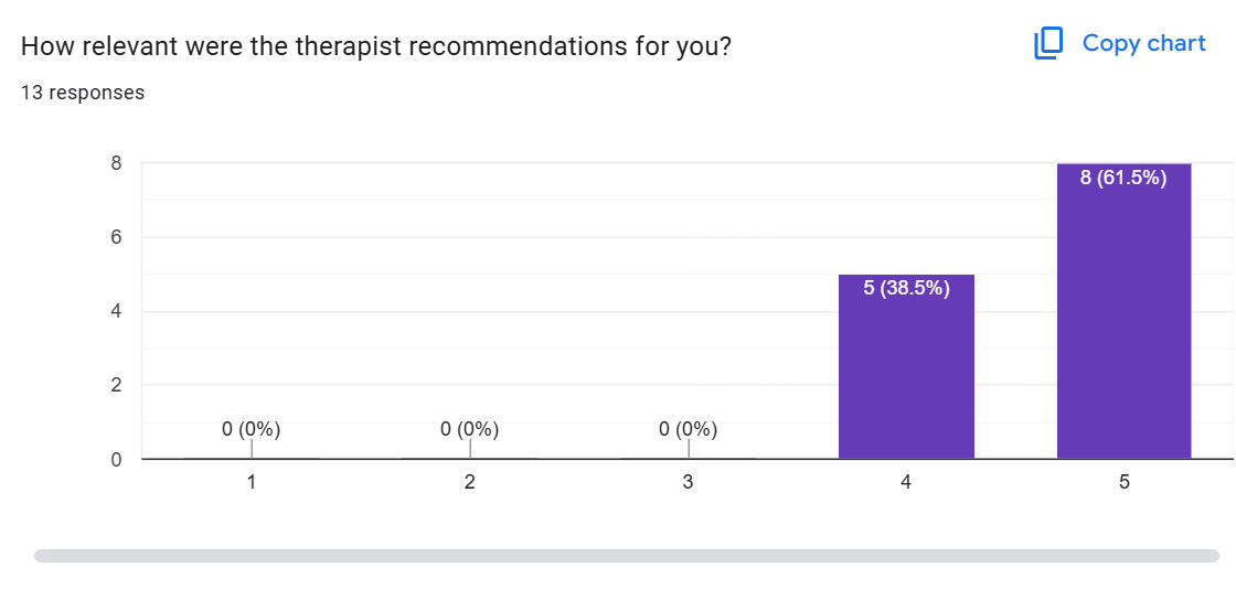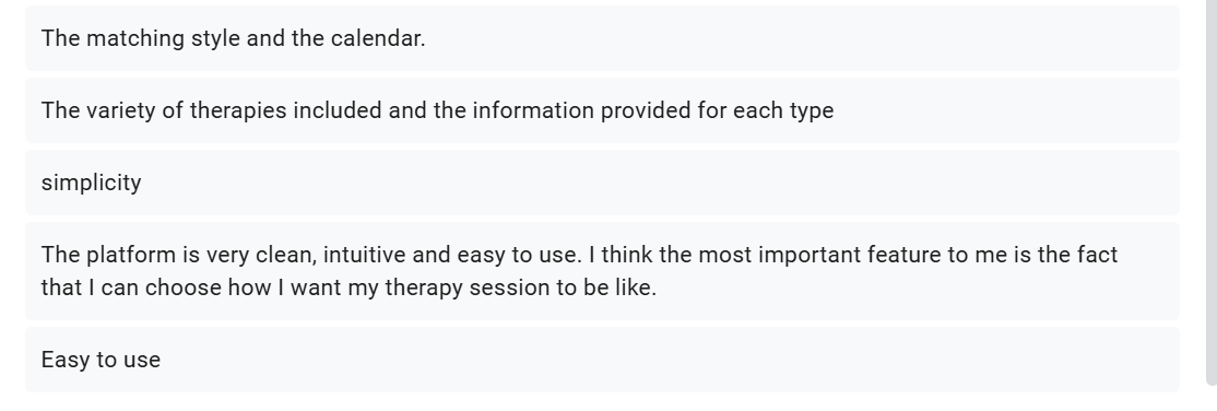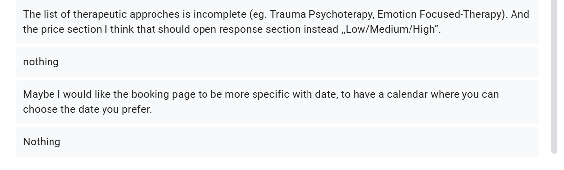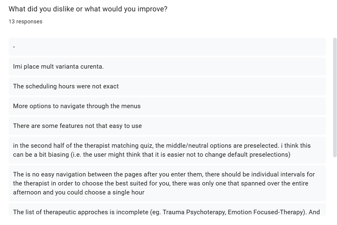 - Feedback calitativ: cerere pentru mai multe abordări (ex: EFT), plus dorință de verificare/validare terapeuți mai clară.