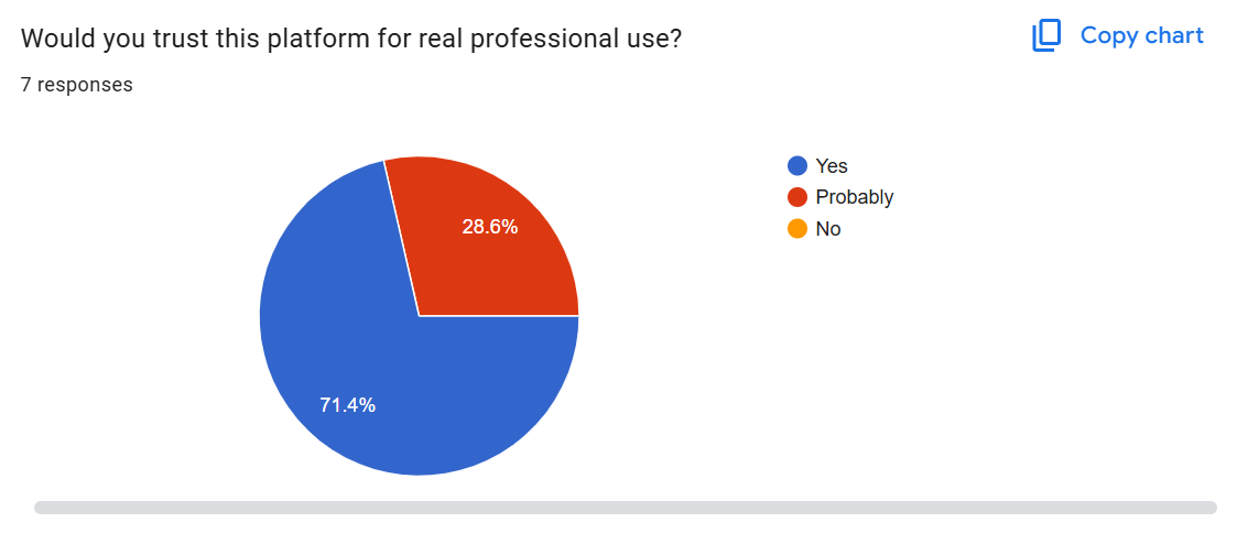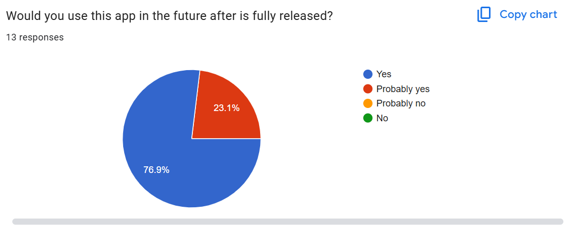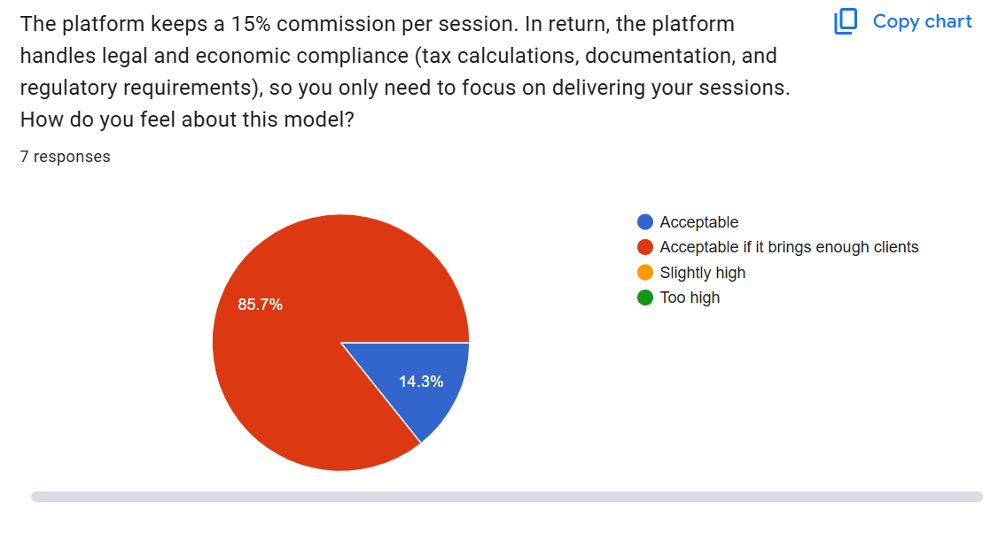 - Willingness to pay: 100% pozitiv (38.5% “Yes”, 61.5% “Probably yes”).