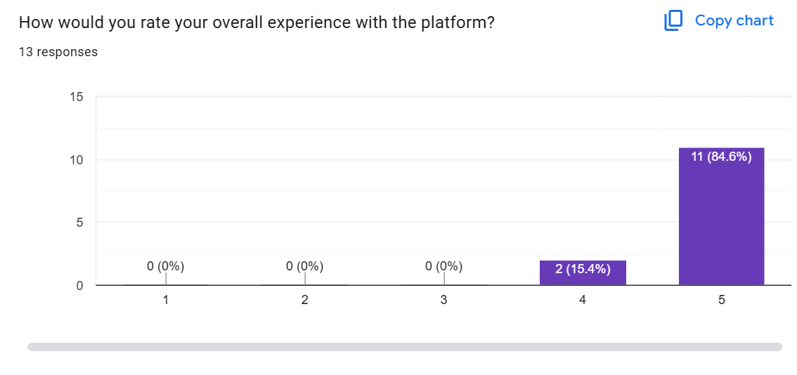 - Experiență overall: 84.6% au dat 5/5, 15.4% au dat 4/5.