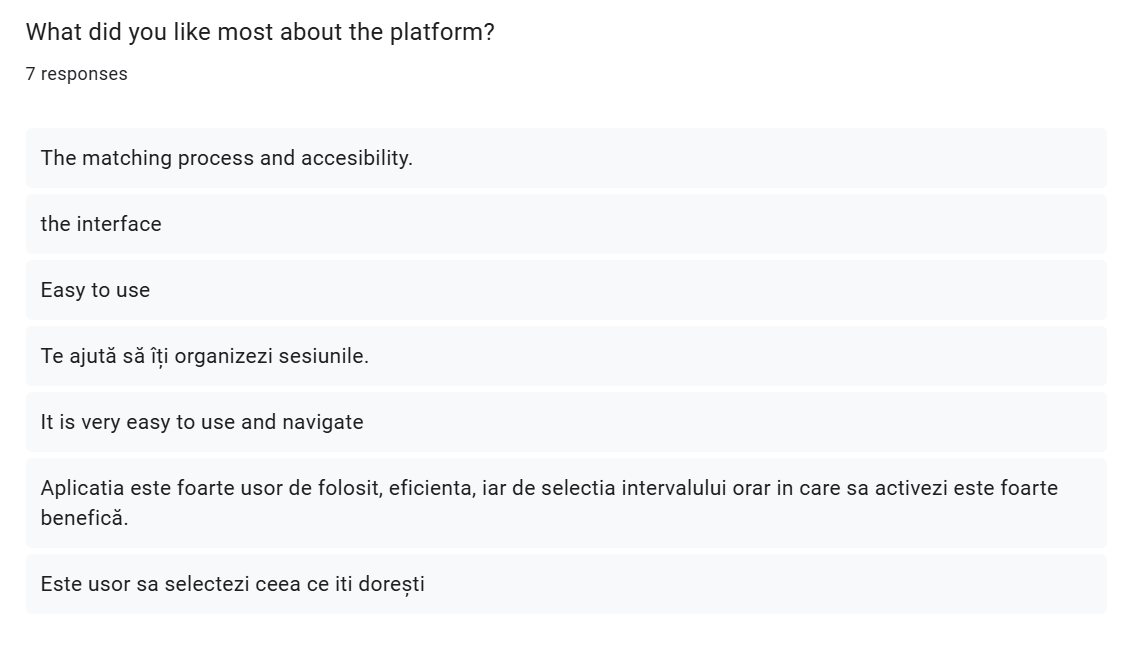 - Puncte forte repetate: matching-ul, claritatea UI/UX, ușurința de utilizare, calendar/booking.