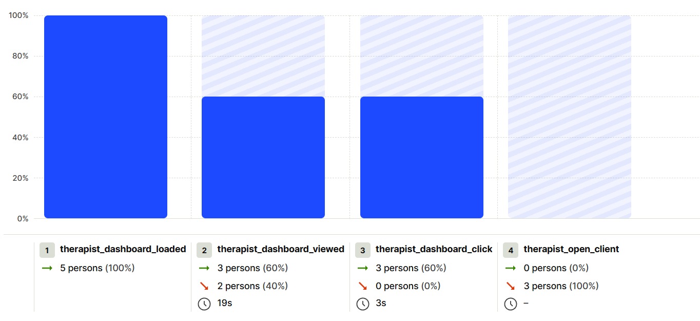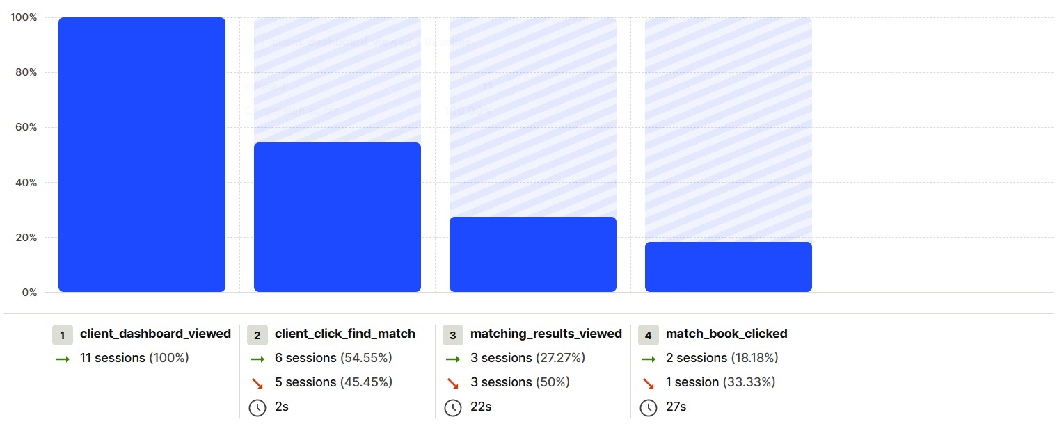 Am instrumentat flow-ul principal al clientului în PostHog (dashboard → find match → results → booking click). Astfel putem demonstra că există utilizatori reali care parcurg pașii de conversie.